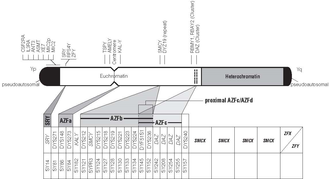 - 無精子症や乏精子症の患者10%~15%に、Y染色体長腕上に存在するAZF領域の一部あるいは全体の欠失が認められます3)。