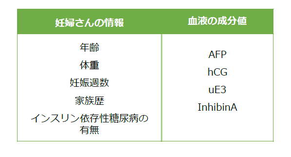 4つの成分は、赤ちゃんまたは胎盤で産生されたものが、母体血液中に流出したものです。体重の増加により各成分が希釈されるため、計算式に加えられています。 - 家族歴