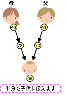 染色体には人間の設計図にあたる遺伝子が集まっています。人の体は、顕微鏡でやっと見えるほどの小さな細胞が集まってできており、それぞれの細胞が染色体というものを46本持っています。下の図のように、精子と卵子が受精することにより、赤ちゃんは染色体をそれぞれ23本ずつ受け継ぎます。 したがって、人は、下の図のような2本1組となった染色体を23組、合計46本を持つことになります。